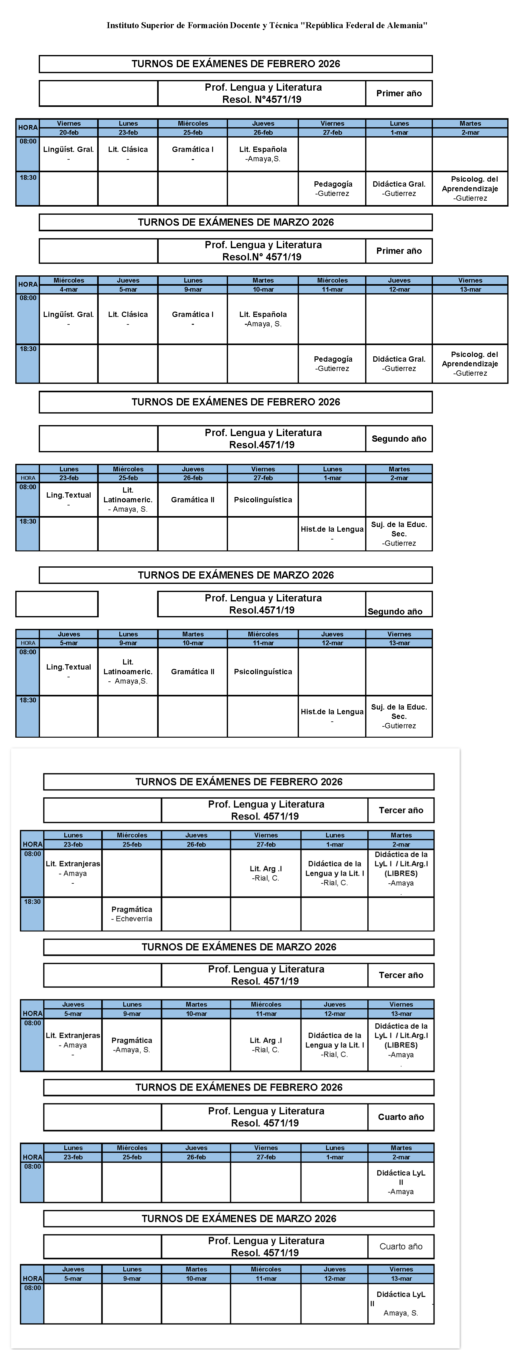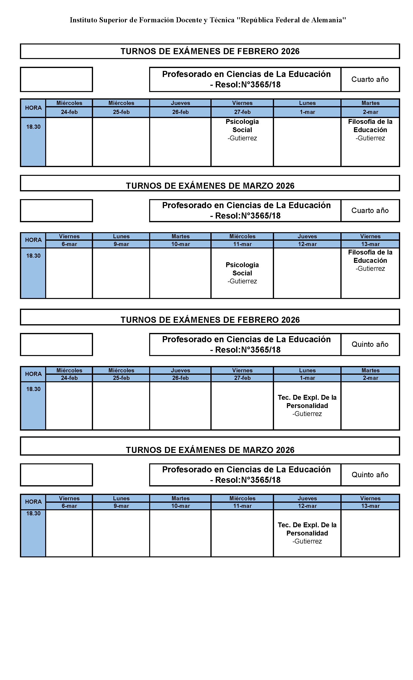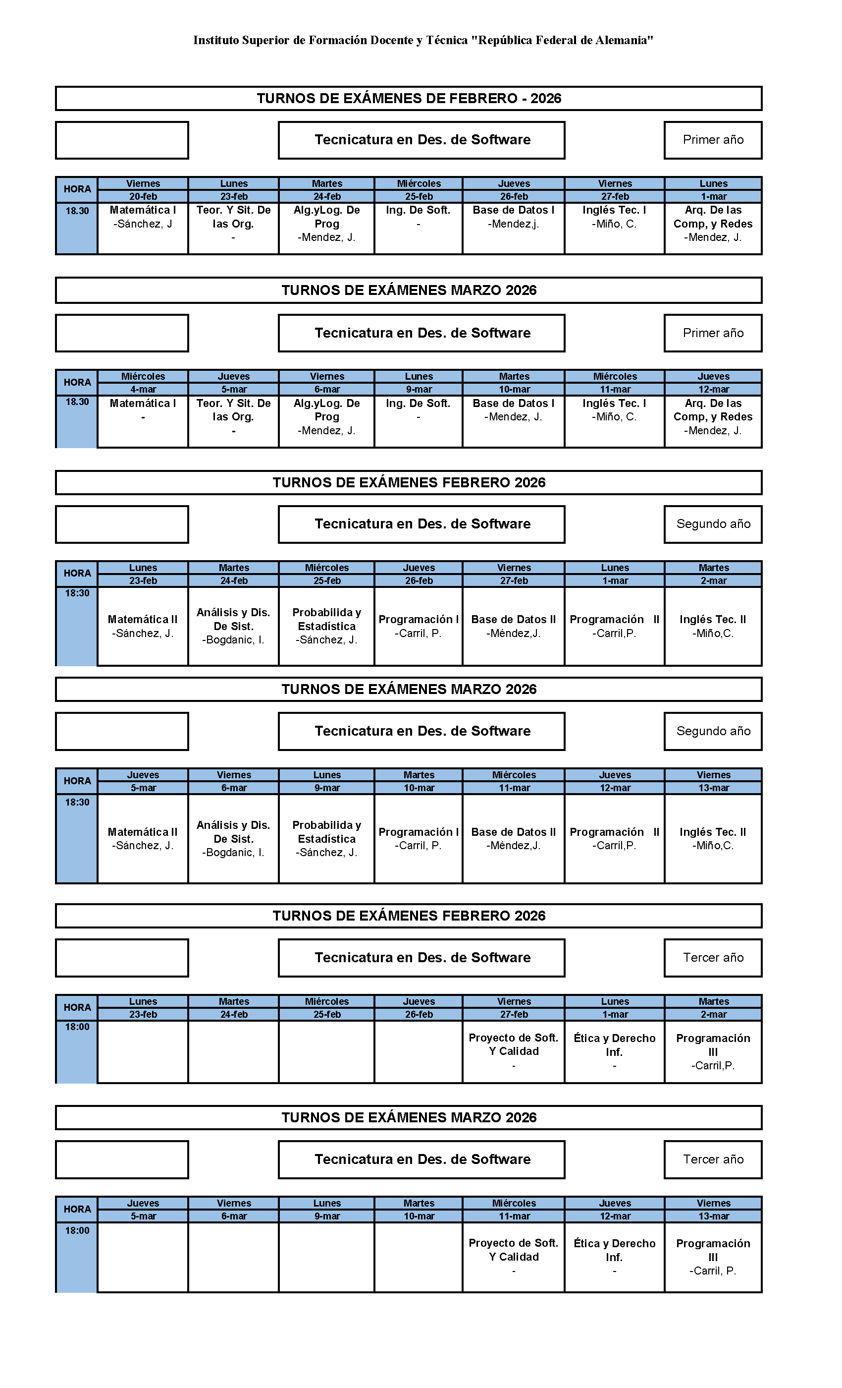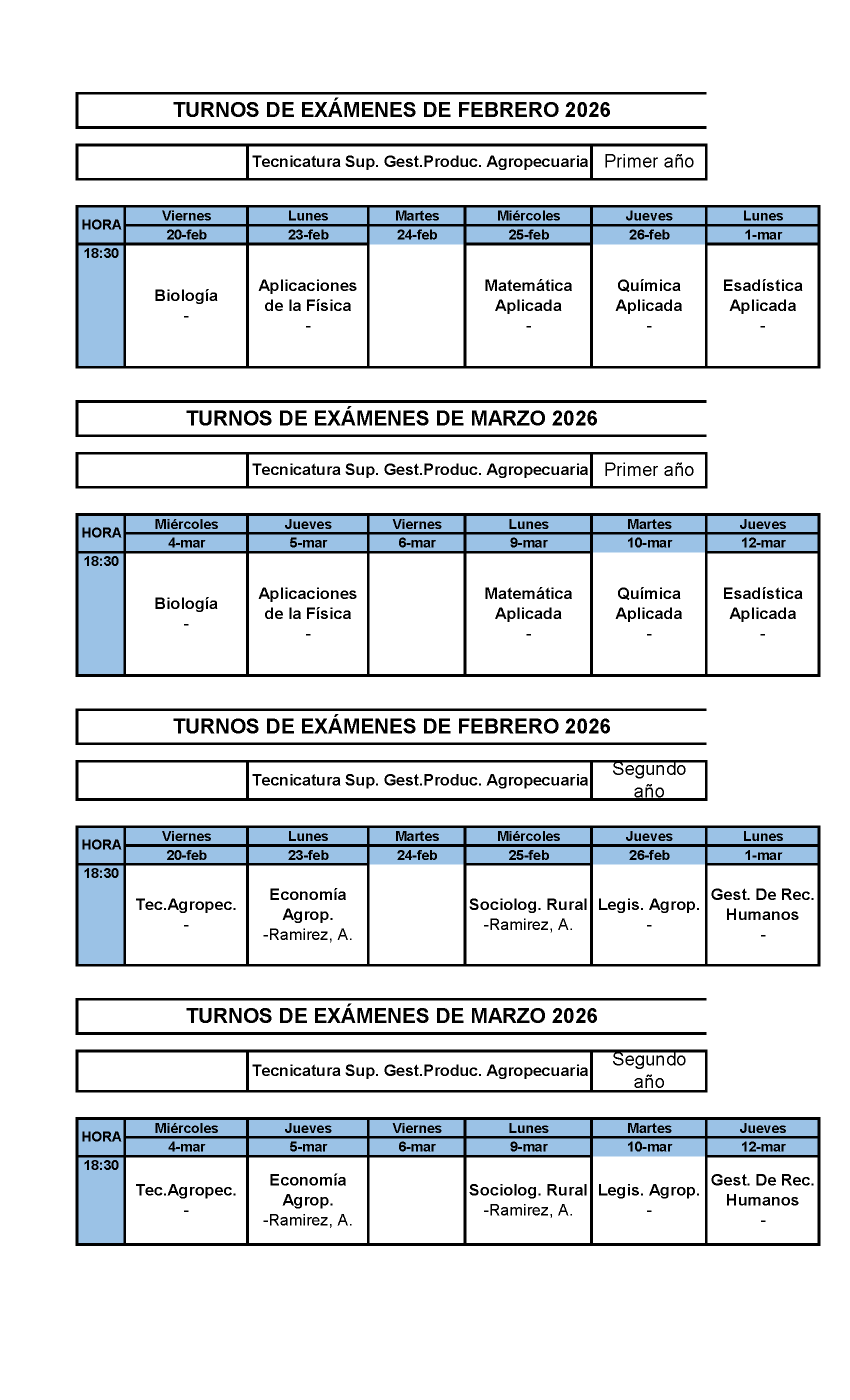 Horario de exámenes Período Febrero Marzo de 2026